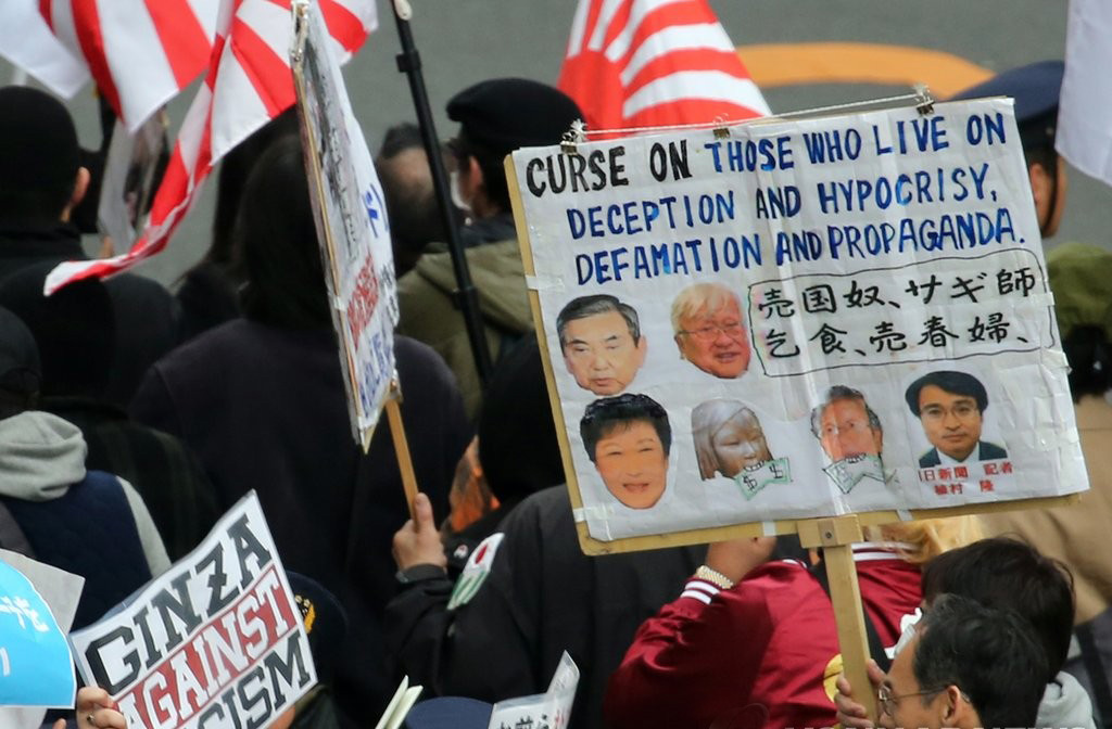 조선학교 보조금 중단 시위 속 '한국 비하 팻말'= 2016년 3월 6일 일본 도쿄도(東京都) 주오(中央)구 긴자(銀座) 거리에서 열린 시위 참가자가 든 팻말에 '사기, 위선, 명예훼손, 선전으로 사는 이들을 저주한다'(Curse on those who live on deception and hypocrisy, defamation and propaganda.)는 글과 고노 요헤이(河野洋平) 전 일본 중의원 의장, 박근혜 당시 대통령, 평화의 소녀상, 우에무라 다카시(植村隆) 전 아사히(朝日)신문 기자 등의 얼굴 사진이 담겨 있다. 또 매국노, 사기꾼, 걸식, 매춘부 등의 단어가 함께 적혀 있다. 우에무라가 우익 세력의 표적이 됐다는 사실을 엿볼 수 있는 장면이다.