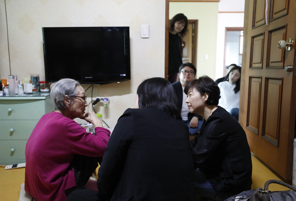 아흔세번째이자 마지막 생신이었던 2018년 4월 26일 오전 김복동 할머니가 서울 마포구 연남동 평화의 우리집 2층 자신의 방에서 축하하러 온 이들과 대화하고 있다.