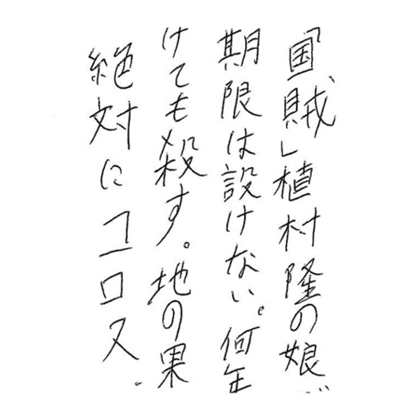 딸 죽이겠다고 협박까지=아사히(朝日)신문 기자로 재직하던 시절 일본군 위안부 피해자인 김학순 씨의 증언을 보도한 우에무라 다카시(植村隆) 씨의 딸을 죽이겠다는 내용의 협박문. 우에무라를 역적으로 규정하고 딸을 살해하겠다고 위협하는 내용이 담겨 있다. [우에무라 다카시 제공]