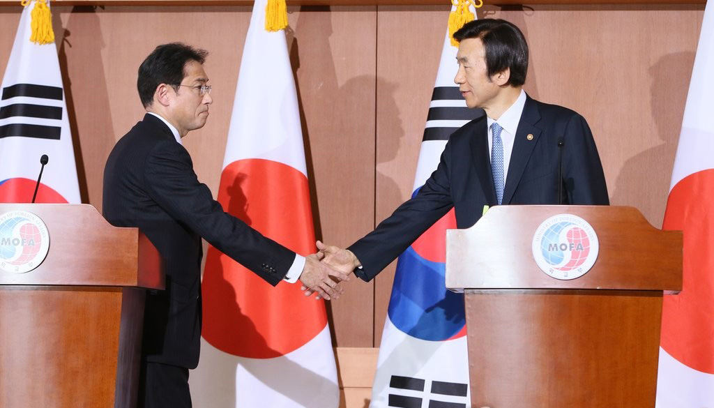 위안부 문제 한일 합의…아베 사죄는 어디로=2015년 12월 28일 윤병세 당시 한국 외교부 장관(오른쪽)과 기시다 후미오(岸田文雄) 당시 일본 외무상이 서울 종로구 도렴동 외교부에서 열린 공동기자회견에서 일본군 위안부 문제에 관한 합의 결과를 발표한 후 악수하고 있다. 기시다는 당시 회견에서 "아베 (신조) 내각총리대신은 일본국 내각총리대신으로서 다시 한번 위안부로서 많은 고통을 겪고 심신에 치유하기 어려운 상처를 입은 모든 분들에 대해 마음으로부터 사죄와 반성의 마음을 표명한다"고 말했으나 이후 아베가 실제 사죄하는 모습을 볼 수는 없었다.