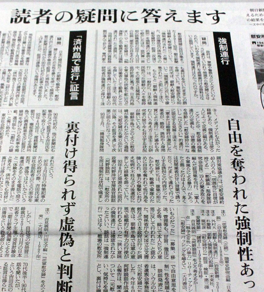 위안부 문제 보도 취소한 아사히신문= 2014년 8월 5일 일본 도쿄(東京)에서 배달된 아사히(朝日)신문 조간에 2차대전 때 제주도에서 다수 여성을 강제로 끌고 갔다고 밝힌 일본인 요시다 세이지(吉田淸治)의 증언이 거짓이라고 판단하고 이에 기반을 둔 1980∼90년대 자사 기사를 취소한다는 설명이 실려 있다. 아사히신문의 기사 취소는 '우에무라 때리기'를 본격화하는 계기가 됐다.
