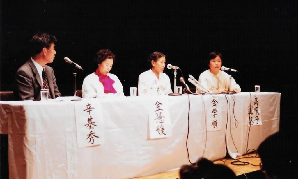 '일본군 위안부 피해' 김학순 공개증언 30주년= 일본군 위안부 피해자라고 공개적으로 증언한 김학순(왼쪽 세번째)할머니가 1991년 12월 7일 일본 오사카에서 열린 일본 최초의 증언집회에 참석하고 있다.[김혜원 기증, 이나영 정의기억연대 이사장 제공]