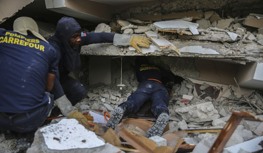 아이티 레카이의 무너진 건물에서 생존자 수색하는 구조대원들 [AP=연합뉴스]