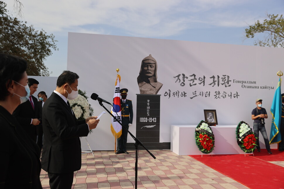 ‘홍범도 장군 유해봉환 대통령 특사단'의 황기철 단장(국가보훈처장)이 14일) 카자흐스탄 크즐오르다 홍범도 묘역에서 열린 추모식에 참석하여 정부를 대표해서 추모사를 하고 있다.