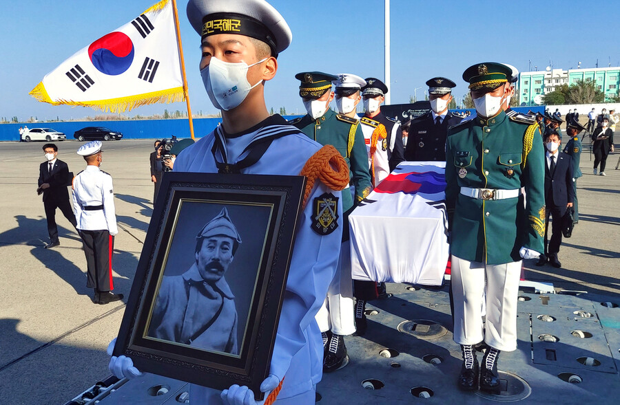 홍범도 장군 유해가 15일 한국으로 봉환되기 위해 카자흐스탄 크즐오르다 공항에서 국군의장대에 의해 특별수송기(KC-330)에 옮겨지고 있다. 홍 장군의 유해는 전날 크즐오르다에 있는 묘역에서 수습돼 소관에 담겨 카자흐스탄 국기로 감싼 뒤 현지 병원에 임시 안치했다가 이날 대관으로 옮겨져 태극기로 관포돼 특별수송기에 옮겨졌다. 크즐오르다/연합뉴스