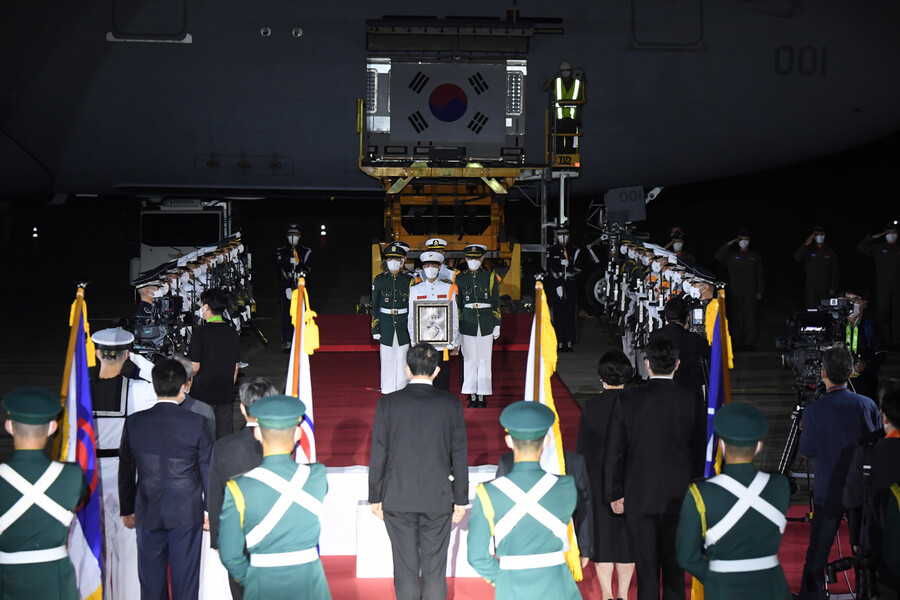 봉환식이 열린 서울공항에는 문 대통령 부부와 유영민 대통령 비서실장, 서훈 국가안보실장, 서욱 국방부 장관 등이 참석했다. 문 대통령 부부를 비롯한 참석자들은 '장군의 귀환'이라는 문구가 적힌 마스크를 착용했다.