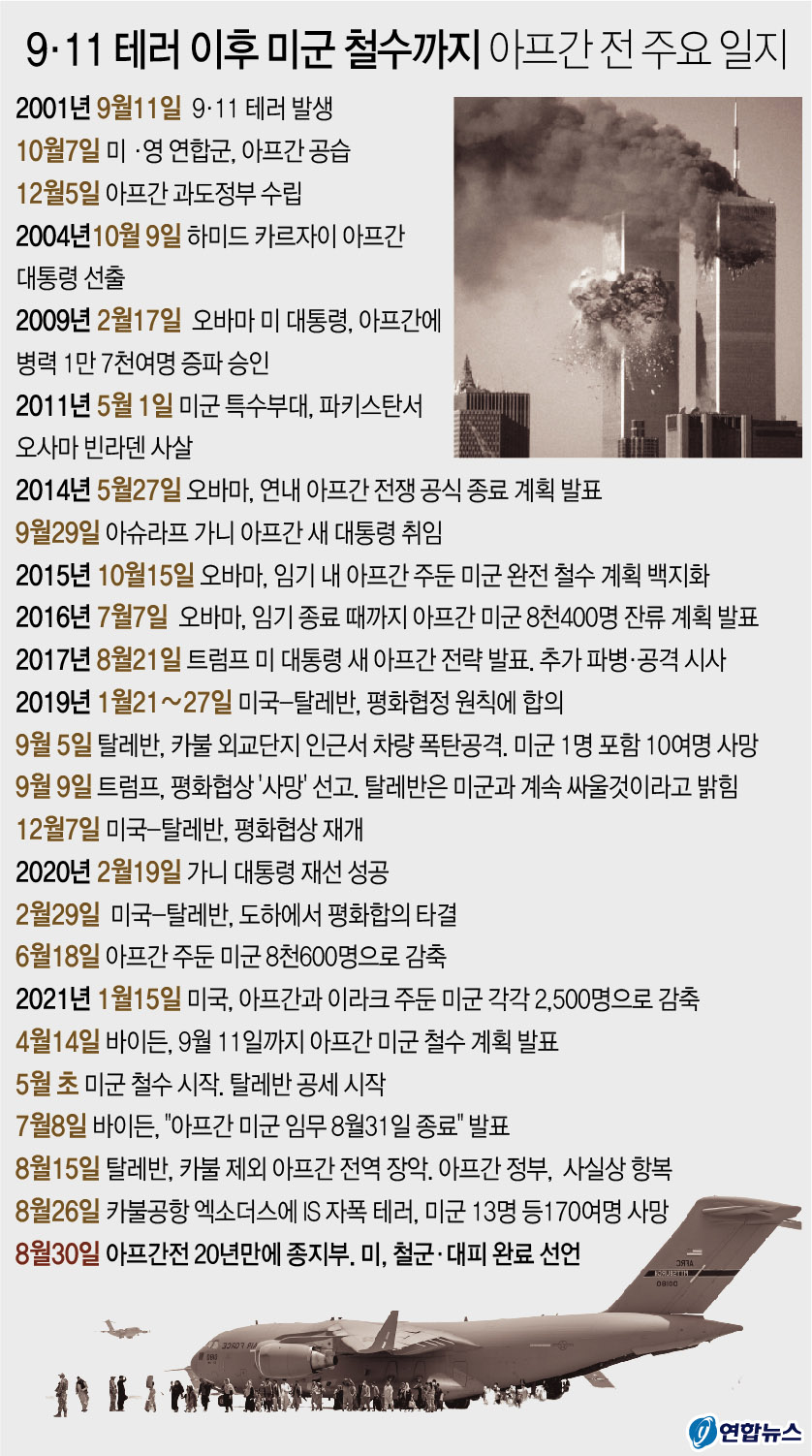 2001년 뉴욕 무역센터 등에 대한 무장조직 알카에다의 9·11 테러에서 촉발된 아프간전은 이날 미국이 미군 철수와 민간인 대피 완료를 선언함에 따라 공식 종료했다.