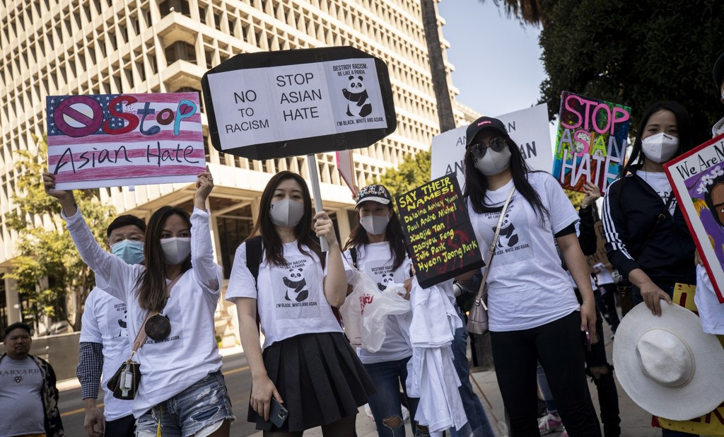 '증오범죄 규탄' 미 LA 집회에 참석한 아시아계 여성들= 지난 3월 27일 미국 캘리포니아주 로스앤젤레스(LA)에서 열린 증오범죄 규탄 집회에 참석한 아시아계 여성들이 '아시아인에 대한 증오를 멈춰라'고 쓰인 피켓 등을 들고 있다.