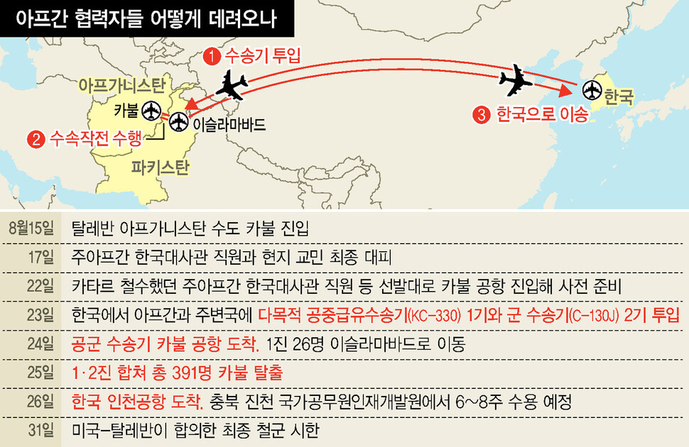 정부는 아프간에서 탈레반의 공세가 거세진 8월 초부터 민간항공기를 이용해 한국을 도운 아프간인들의 국내 이송을 준비했지만, 상황이 급박해지자 지난 23일 한국군 수송기 3대를 현지에 보냈다.