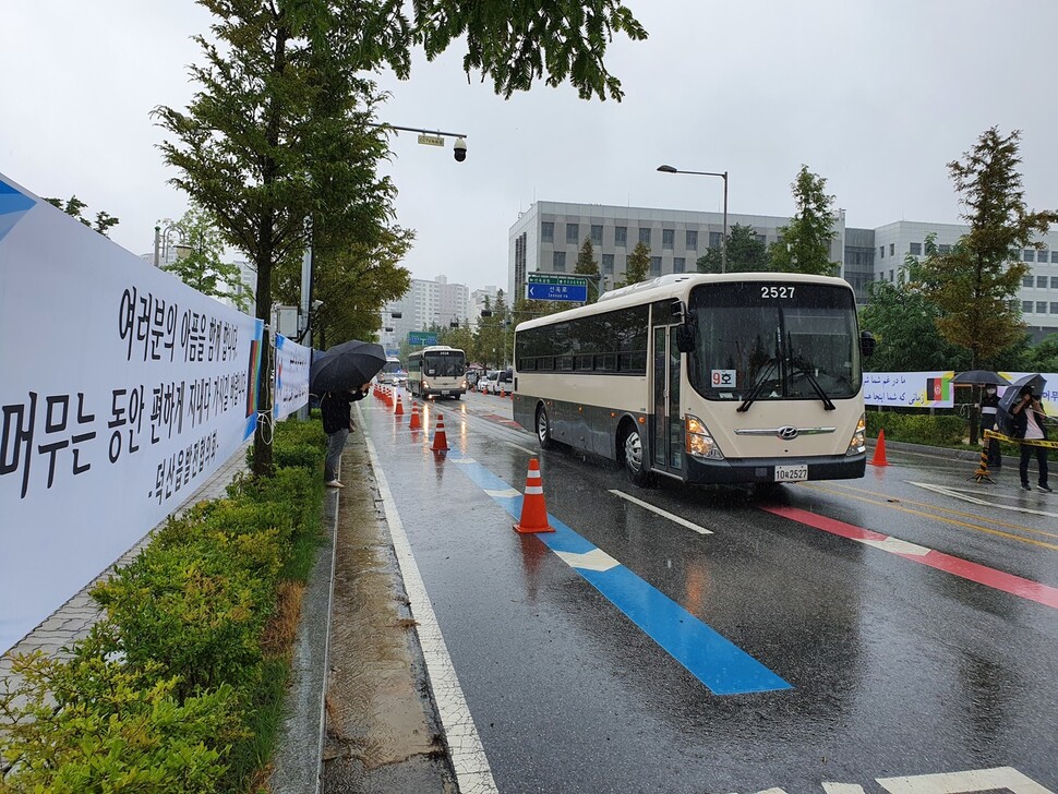 이들을 태운 버스가 통과한 국가 인재원 앞길에는 ‘여러분의 아픔을 함께 합니다’(덕산읍 기업체협의회), ‘머무는 동안 편하게 지내다 가시길 바랍니다’(덕산읍 발전협의회) 등 환영 펼침막이 걸렸다. ‘따뜻한 마음으로 아프가니스탄 가족들을 맞아주신 주민 여러분 고맙습니다’(충북참여자치시민연대) 등 이들의 임시 체류를 받아들인 진천·음성 군민들의 결정을 칭찬하는 펼침막도 더러 보였다.