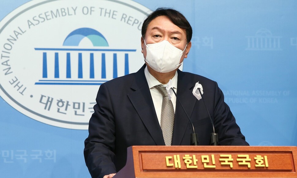 국민의힘 대권주자인 윤석열 전 검찰총장이 지난 22일 서울 여의도 국회 소통관에서 여당이 단독 강행 처리한 언론중재법 개정안에 대한 입장을 밝히고 있다. 연합뉴스