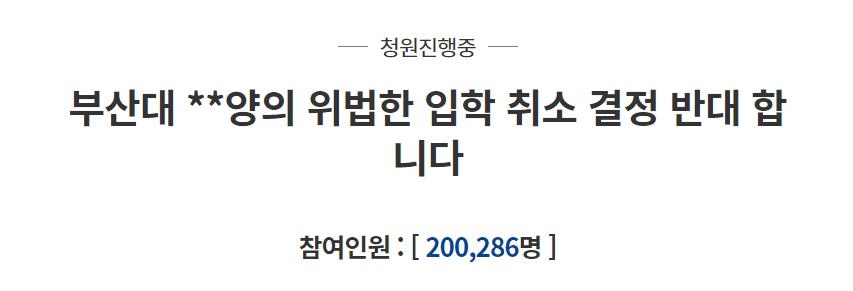 한 청원인은 지난 24일 '부산대의 위법한 입학 취소 결정 반대합니다'라는 제목의 글을 청와대 국민청원 게시판에 올렸고, 25일 오후 9시 30분 현재 이 청원에 참여한 인원은 20만명을 넘겼다.