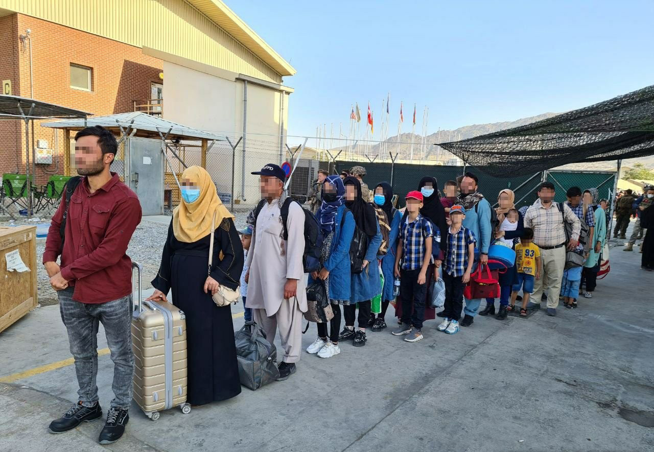 공군 수송기 탑승 기다리는 아프간 협력자들=한국 정부와 협력한 아프가니스탄인들이 신원확인을 마친 뒤 한국 공군 수송기 탑승을 기다리고 있다.