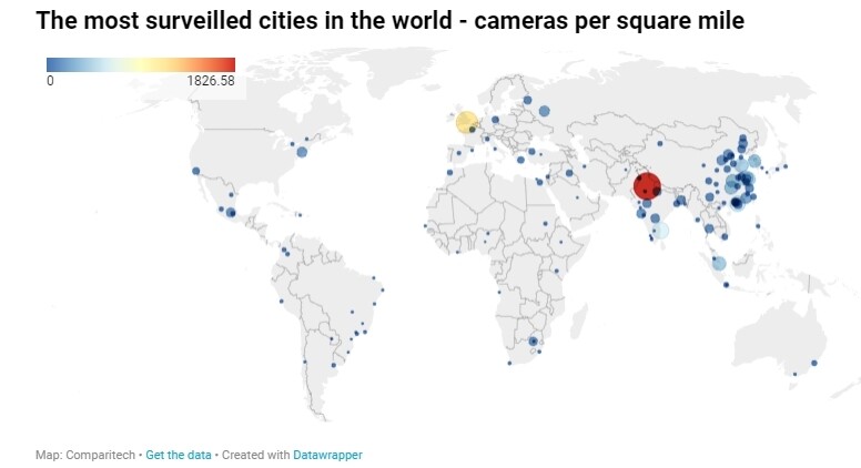 인구당 감시 카메라 수로 보면 중국 대도시의 감시 네트워크가 압도적이다. 산시성의 성도 타이위안이 인구 1000명당 117대로 1위를 차지한 것을 비롯해 상위 20개 도시 중 16곳이 중국 도시였다. 중국 외의 도시로는 영국 런던과 인도의 인도르, 하이데라바드, 델리 네곳이 각각 3, 4, 12, 16위를 차지했다. 20위 안에 든 인도 도시가 세곳이나 되는 점이 눈에 띈다.