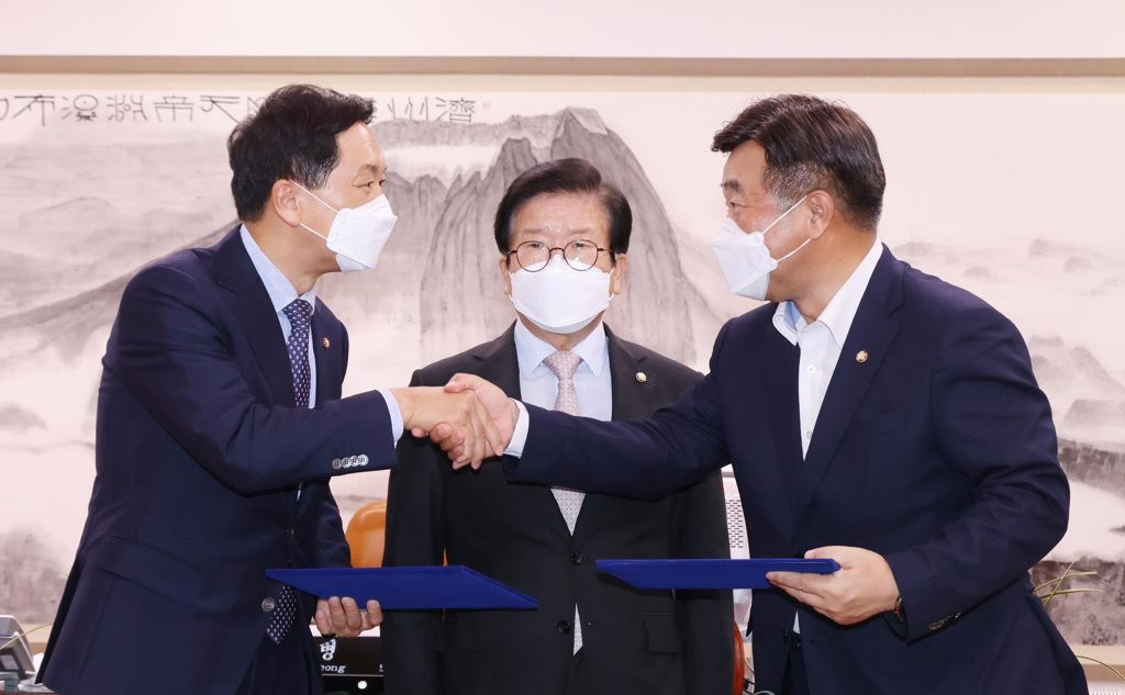 더불어민주당 윤호중 원내대표와 국민의힘 김기현 원내대표는 이날 오후 국회에서 박병석 국회의장 주재로 만나 이와 같은 합의서에 서명했다.