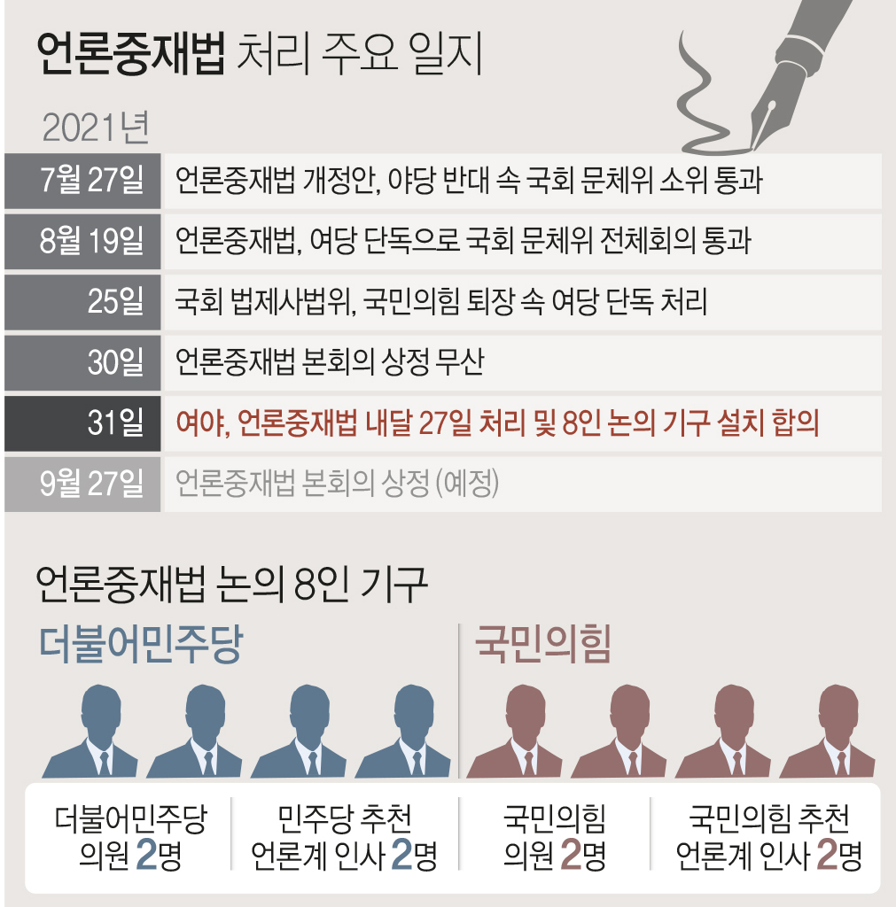 여야는 31일 언론중재법 개정안의 본회의 상정을 내달 27일로 미루고 8인 협의체를 꾸려 논의하기로 했다.