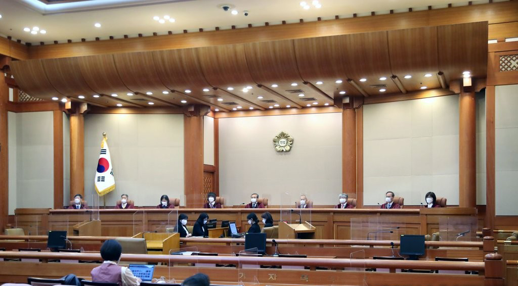 헌재, 조선인 전범 피해자 헌법소원 선고= 유남석 헌법재판소장과 재판관들이 31일 오후 서울 종로구 헌법재산소에서 열린 조선인 전범 피해자 헌법소원과 방송법 조항 헌법소원 등에 대한 선고를 위해 대심판정에 입장, 자리에 앉아 있다.