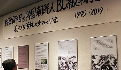 한국인 BC급 전범 문제 사진전= 2014년 4월 27일 동진회와 동진회를 응원하는 모임이26일 도쿄도(東京都) 나카노(中野)구 '나카노제로'에서 한국인 BC급 전범 문제 해결을 촉구하며 개최한 전시회에 방문객이 전시물을 살펴보고 있다. [연합뉴스]