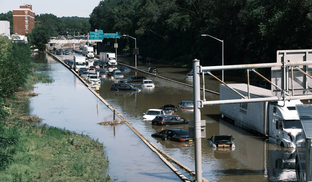 뉴욕 주요도로인 맨해튼 동쪽 ‘에프디아르’(FDR)로 및 ‘브롱스 리버 파크웨이’가 전날 밤부터 폭우로 잠기기 시작했다. 뉴욕의 지하철과 그 역들도 침수돼, 메트로폴리탄교통청은 모든 지하철 운행을 중단했다. 소셜미디어 등 온라인에서는 지하철 차량에 물이 들어와 승객들이 좌석 위에 올라선 모습을 담은 동영상들이 올라왔다.