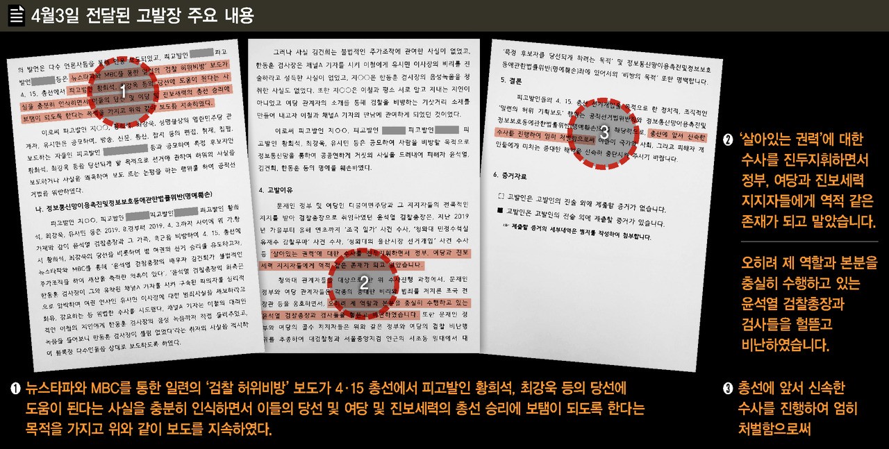 앞서 <뉴스버스>는 지난해 4·15 총선을 앞두고 손준성 대검 수사정보정책관이 당시 미래통합당(국민의힘 전신) 송파갑 김웅 후보에게 유시민·최강욱·황희석 등 여권 정치인에 대한 형사 고발을 사주했다는 의혹을 보도했다. 고발장에는 윤 전 총장 본인과 그의 부인 김건희씨의 피해 사실이 적시돼 있다.