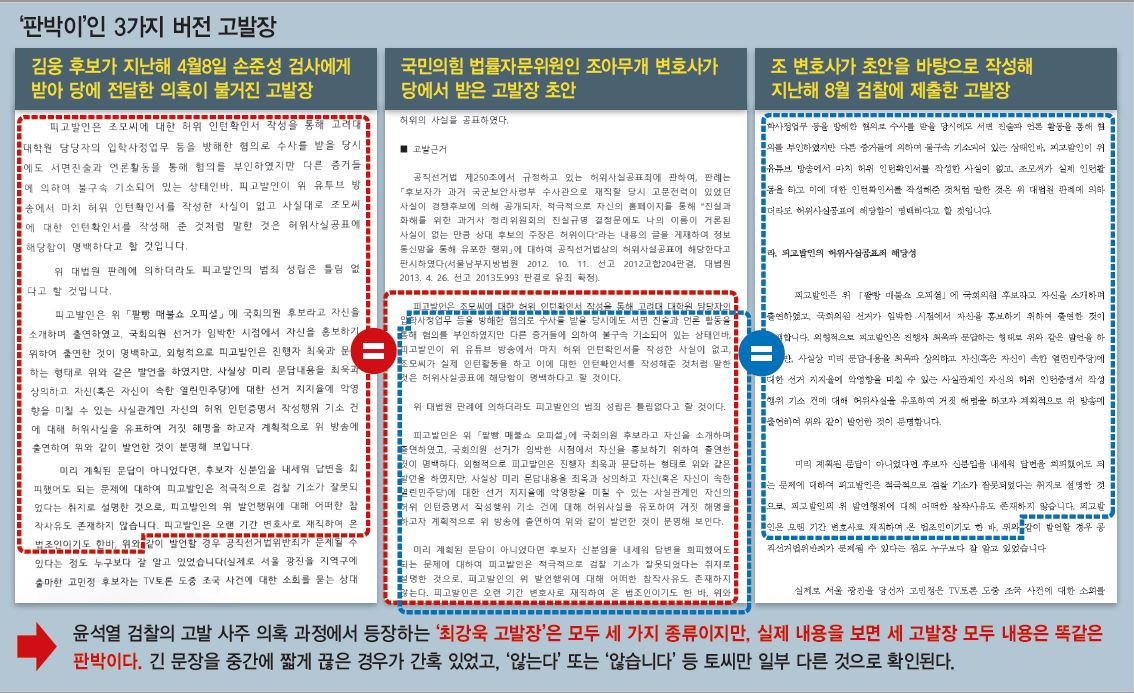 당시 미래통합당 법률지원단장인 정점식 의원 쪽이 이 고발장과 내용과 형식이 판박이인 고발장 초안을 ㅂ당무감사실장에게 전달했고, ㅂ실장은 이를 다시 받아 법률자문위원인 조아무개 변호사에게 전달한 것이다. 조 변호사는 넉 달 전 김웅 의원이 받았다는 내용과 사실상 똑같은 고발장을 다시 썼고, 이를 미래통합당 이름으로 대검에 접수했다.