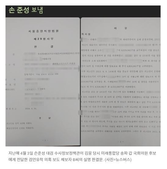 인터넷 매체 <뉴스버스>가 2일 보도한 내용을 종합하면, 지난해 4월3일 손준성 당시 대검찰청 수사정보정책관은 당시 4·15 총선에 출마한 미래통합당 소속 김웅 국회의원 후보(현 국민의힘 의원)에게 유시민 노무현재단 이사장, 최강욱 열린민주당 대표 등 여권 인사와 언론사 기자 등에 대한 고발장을 전달하면서 검·언유착 사건의 제보자인 지씨의 과거 범죄사실이 적시된 실명 판결문까지 전달했다고 한다. 당시 윤 전 총장의 최측근인 한동훈 검사장이 연루된 ‘검·언유착 의혹’의 제보자가 범죄를 저지른 이로 신뢰할 수 없는 인물임을 강조하기 위한 목적에서 판결문까지 보냈다는 의혹이다.