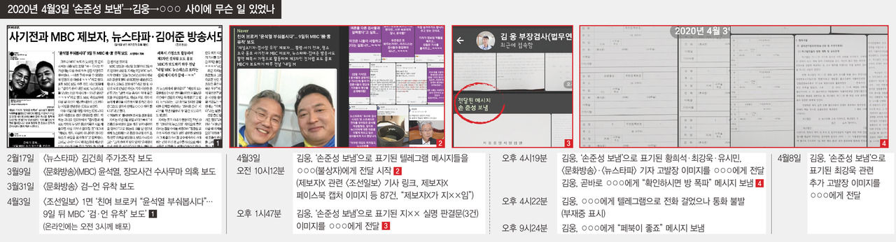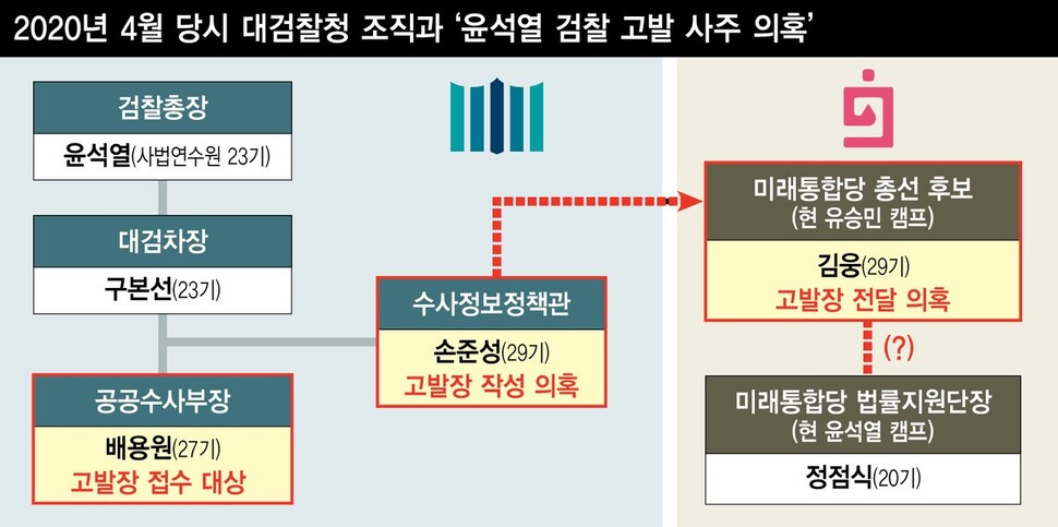 2일 인터넷매체 <뉴스버스> 보도와 <한겨레> 취재 내용을 종합하면, 지난해 4월3일 김웅 당시 미래통합당 국회의원 후보(현 국민의힘 의원)는 유시민 노무현재단 이사장과 최강욱·황희석 당시 열린민주당 비례대표 국회의원 후보 등 3명과 언론사 관계자를 포함해 모두 11명에 대한 고발장을 미래통합당 쪽에 전달했다. 이 고발장은 윤 전 총장의 최측근인 손준성 당시 대검찰청 수사정보정책관이 김웅 후보에게 건넨 것으로 확인됐다고 <뉴스버스>는 보도했다.