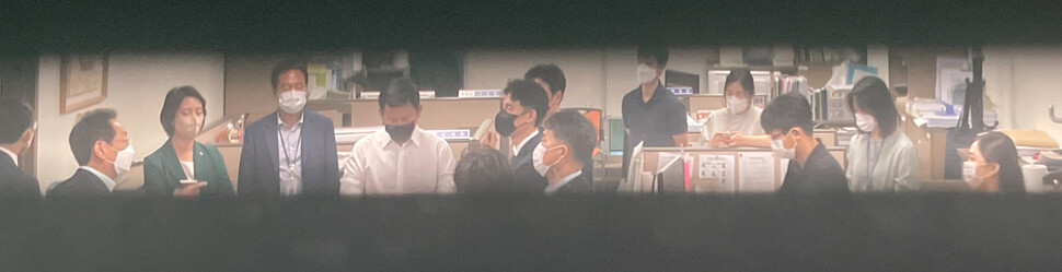 김웅의원실을 압수수색한 공수처 수사관들과 이를 바라보는 김웅 의원(왼쪽)