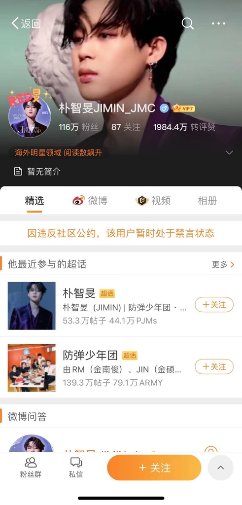 연합뉴스가 지민 팬들의 웨이보 계정에 들어가 보니 '규정 위반으로 이 이용자 계정은 정지 상태'라는 문구가 나온다.
