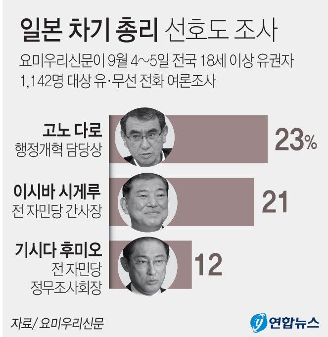 요미우리의 직전 지난달 7~9일 여론조사 때 차기 총리 선호도는 이시바 전 간사장 19%, 고노 담당상 18%였는데 이번 조사에서 역전됐다.