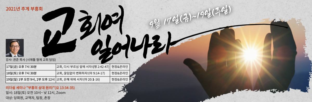 ‘교회여 일어나라’는 주제로 여는 이번 온-오프라인 부흥집회에서 권준 목사는 첫날인 9월17일 저녁 7시30분에 사도행전 2장 42~47절을 본문으로 ‘교회, 다시 부르심 앞에 서자!’라는 제목의 말씀을 전한다. 이어 18일(토) 저녁 7시30분에는 ‘교회, 끊임없이 변화하자!’(마 9:14~17)라는 제목으로 설교한다. 19일 주일에는 오전 9시 1부와 낮 12시 2부 예배 시간에 ‘교회, 은혜 위에 서자!’(마 20: 1~16)라는 제목으로 말씀을 전한다.