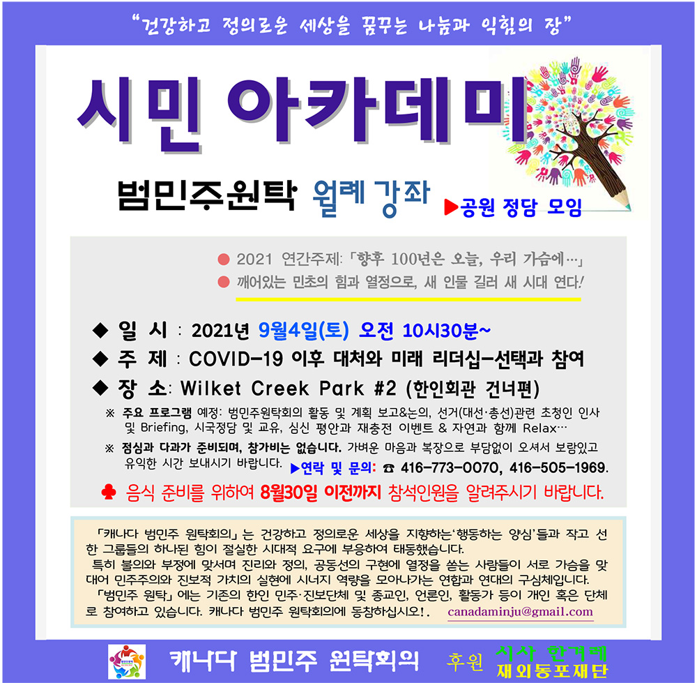 캐나다 범민주원탁회의는 지난 9월4일 노스욕 Wilket Creek 공원에서 COVID-19 팬데믹 이후 1년7개월만의 대면 회합을 겸한 제23차 시민아카데미를 열고 그동안의 주요 활동사항과 향후 계획을 공유하는 한편, 캐나다 총선과 한국 대선 등에 대한 투표참여 방안 등을 논의했다.