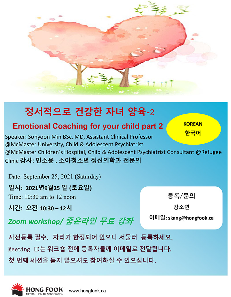 홍푹정신건강협회는 오는 9월25일(토) 오전 10시30분부터 12시까지 ‘정서적으로 건강한 자녀교육’ 주제의 무료 한국어 부모세미나를 온라인으로 개최한다.