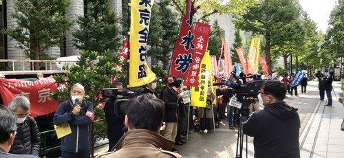 "배상 외면 일본 기업이 부끄럽다"…미쓰비시·일본제철 앞 시위= 2020년 10월 30일 '나고야 미쓰비시·조선여자근로정신대 소송지원 모임' 등 일본 시민단체 회원 20여 명이 도쿄 마루노우치에 있는 미쓰비시중공업 본사 건물 앞에서 징용 피해자들에 대한 사죄와 배상을 촉구하는 시위를 벌이고 있다. [연합뉴스]