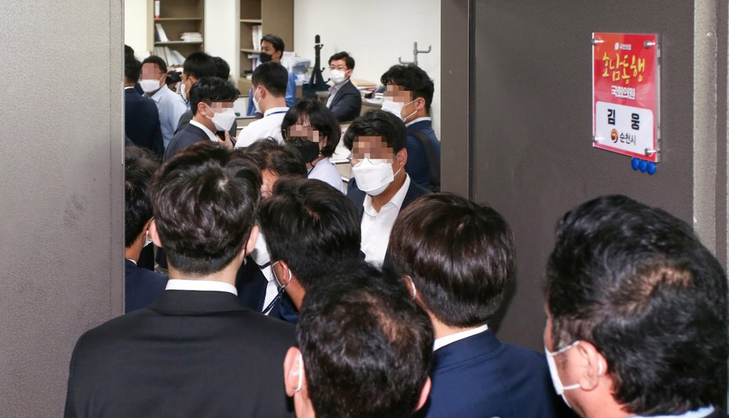 압수수색에 나선 공수처 수사관들과 이를 바라보는 김웅 의원(왼쪽)