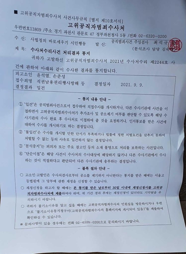 '고발 사주' 의혹 입건 통지서 [사법정의바로세우기시민행동 제공]