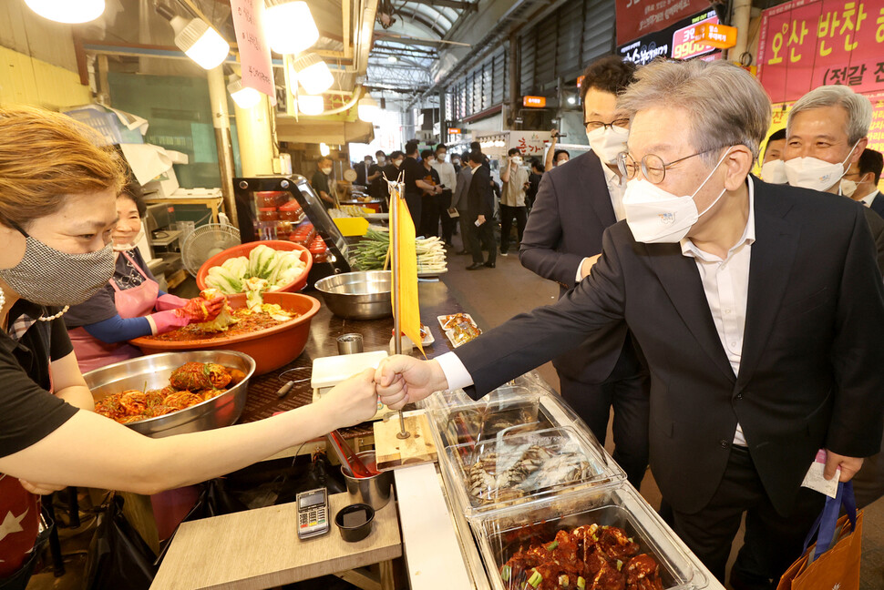 이재명 경기도지사가 13일 오후 경기도 오산시 오색시장을 방문해 상인들과 인사를 나누고 있다. 연합뉴스