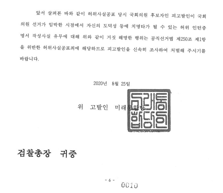 지난해 8월25일 미래통합당이 당 공식계통을 거쳐 대검찰청에 접수한 최강욱 열린민주당 의원 고발장. 미래통합당 직인이 찍혔다.