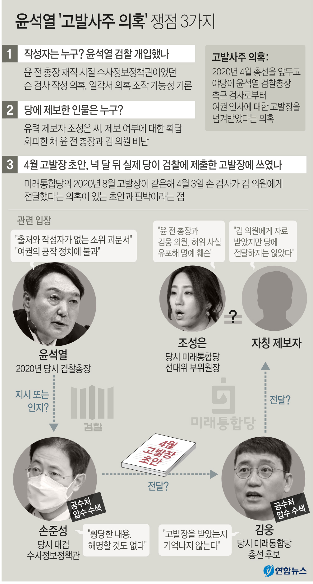 윤석열 '고발사주 의혹' 쟁점 3가지= 정치권을 강타한 고발사주 의혹이 진실게임 양상으로 변질되고 있다. 현재까지 제기된 의혹들을 쟁점별로 나눠 보면 제보자가 누구인지, 작성자는 누구인지, 검찰이 출처라는 초안이 실제 고발장에 쓰였는지 등이다.