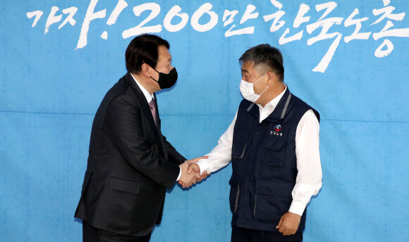 윤석열 전 검찰총장이 15일 오후 한국노동조합총연맹을 방문했다. 연합뉴스