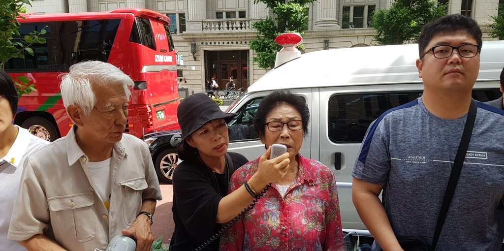 일본 정부의 사죄 촉구하는 양금덕 할머니= 일제 강점기에 근로정신대로 일본으로 건너가 노역에 시달렸던 양금덕 할머니가 2019년 6월27일 정기 주총이 열린 미쓰비시중공업 본사 앞에서 죽기 전에 일본 정부의 사죄를 받고 싶다고 말하고 있다.