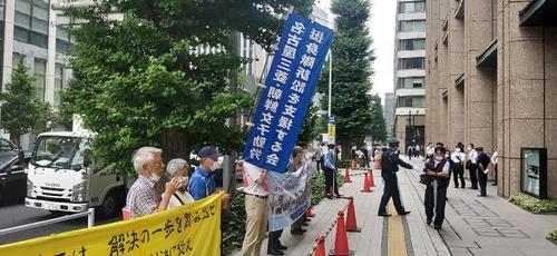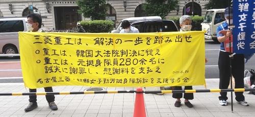 '나고야 미쓰비시·조선여자근로정신대 소송지원 모임' 일본인 회원들이 지난해 6월 26일 미쓰비시중공업 도쿄 본사 앞에서 옛 정신대원 피해자들에게 배상하라는 한국대법원 판결을 이행하라고 촉구하는 시위를 벌이고 있다. [연합뉴스]