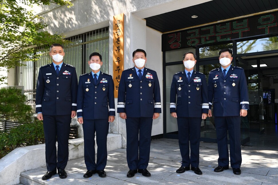 박인호 공군참모총장(가운데)과 초대 공군본부 우주센터장인 박기태 대령(왼쪽 두번째) 등 공군본부 참모들이 30일 계룡대 공군본부에서 열린 ‘공군본부 우주센터' 현판식에서 기념촬영을 하고 있다. 공군 제공