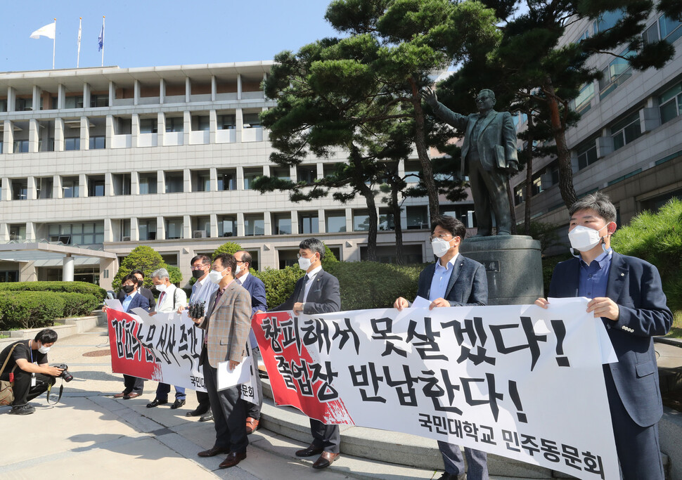 윤석열 전 검찰총장의 부인 김건희씨의 논문 재심사를 촉구하는 국민대 동문 200여명이 1일 학교쪽에 졸업장을 반납했다.