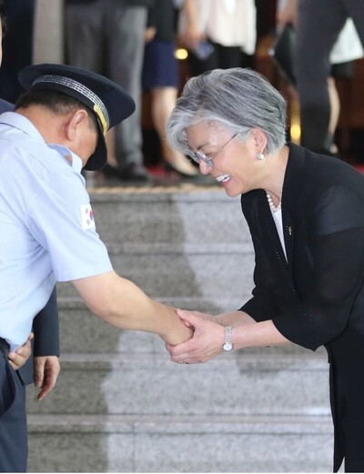 강경화 외교부 장관이 2017년 6월19일 오전 서울 도렴동 외교부 청사에서 열린 취임식이 끝난 뒤 경례를 한 경비 직원에게 다가가 악수를 청하고 있다.