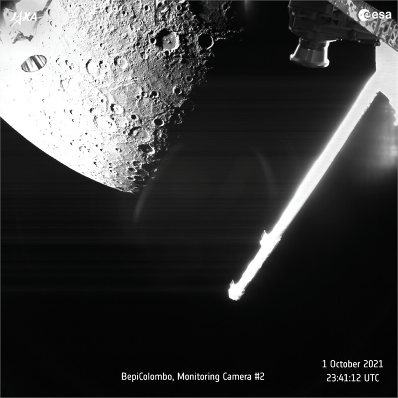 최근접 지점을 통과한 지 10분 후 수성 2418km 거리에서 찍은 사진. 사진에 보이는 지역은 수성의 북반구다. 탐사선의 안테나와 자력계도 사진에 보인다. 유럽우주국 제공