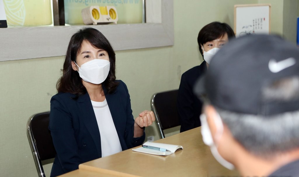 대구 찾은 이재명 지사 부인 김혜경 씨= 더불어민주당 대권 주자인 이재명 경기도지사의 부인 김혜경씨가 지난 9월 3일 대구 달서구 미혼모·한부모가정돕기 '아가쏘잉 협동조합'을 방문해 관계자들과 얘기를 하고 있다. [연합뉴스]