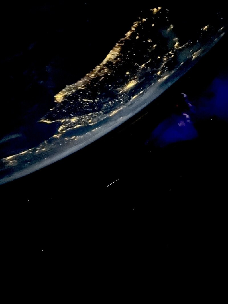 시안 프록터가 우주여행 중 찍은 지구의 밤. 흰줄무늬는 위성의 이동 궤적이며, 오른쪽 푸른색 얼룩은 유리에 빛이 반사돼 생긴 것이다. 시안 프록터 트위터