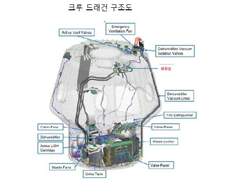 별도의 공간이 있는 국제우주정거장과 달리 크루 드래건의 화장실은 벽걸이형이다. 측면 출입구(출발 때 사용)와 상단 출입구(도킹 때 사용) 사이의 벽에 부착돼 있다. 인스피레이션은 이 상단 출입구를 조망용 돔으로 개조했다.