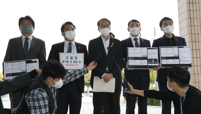 김용민 민주당 최고위원과 ‘고발 사주 국기문란 진상조사 티에프(TF)’ 박주민 단장, 황운하 의원 등은 이날 정부과천청사에 있는 공수처를 방문해 고발장을 접수하며 “윤 전 총장은 측근 한동훈과 채널에이 기자의 유착관계 의혹 사건에 대해 감찰을 중단하도록 지시했고, 전문수사자문단 소집 결정을 통보·지시하는 등 감찰과 수사를 방해해 대검 감찰부와 서울중앙지검의 정당한 권리 행사를 방해했다”고 설명했다.